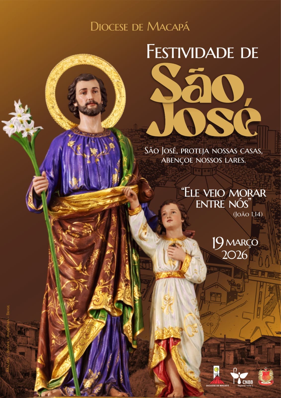 Padroeiro do Estado do Amapá, da capital Macapá e da Diocese, São José é descrito nos evangelhos de Lucas e Mateus. Da descendência de Davi e carpinteiro, foi esposo da Virgem Maria e pai adotivo de Jesus Cristo, por sua história se tornou exemplo de devoção e obediência a Deus. Foi declarado como patrono da Igreja Católica, em 1890 pelo Papa Pio IX, ele é visto como santo das famílias e trabalhadores.
